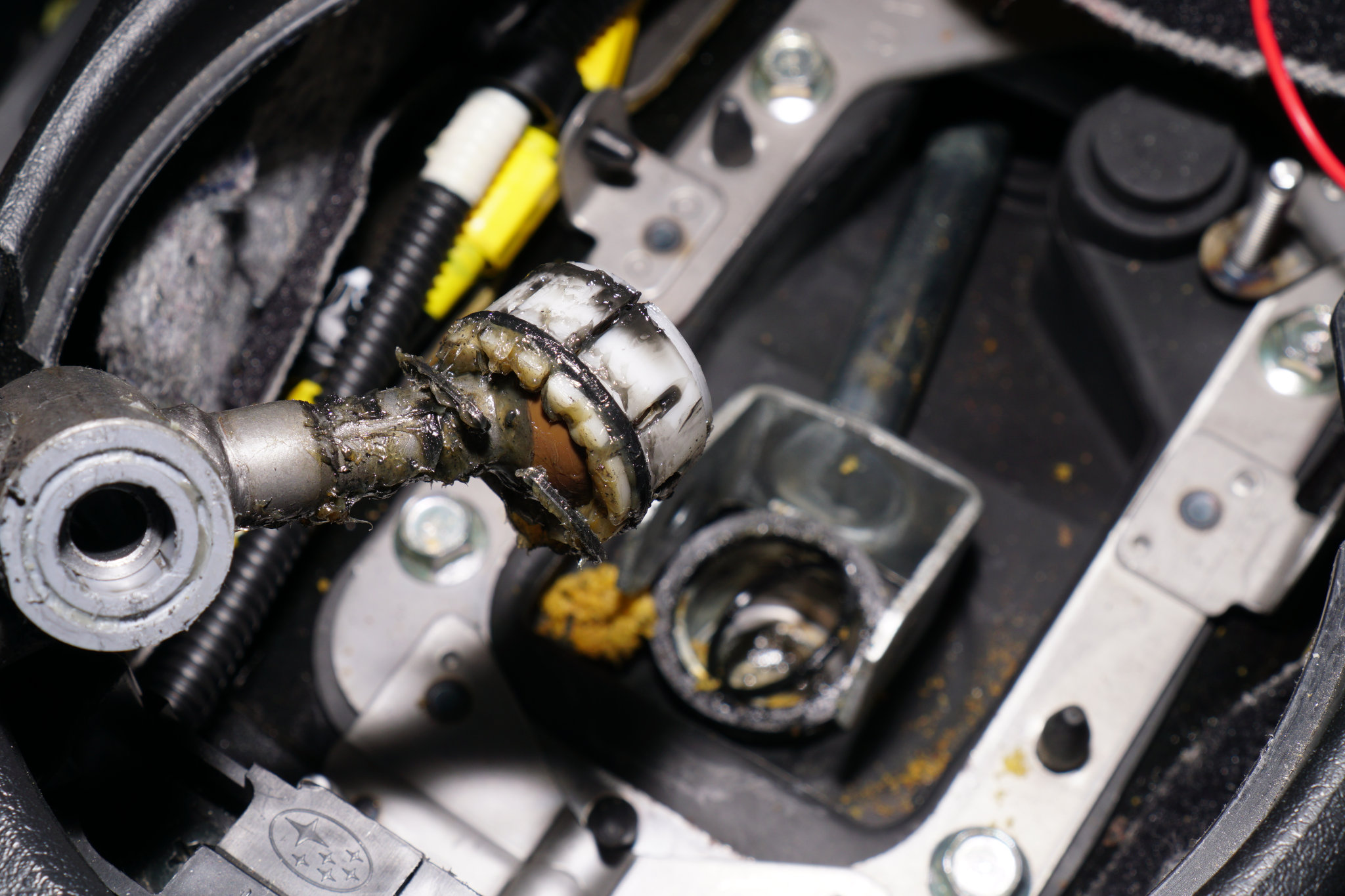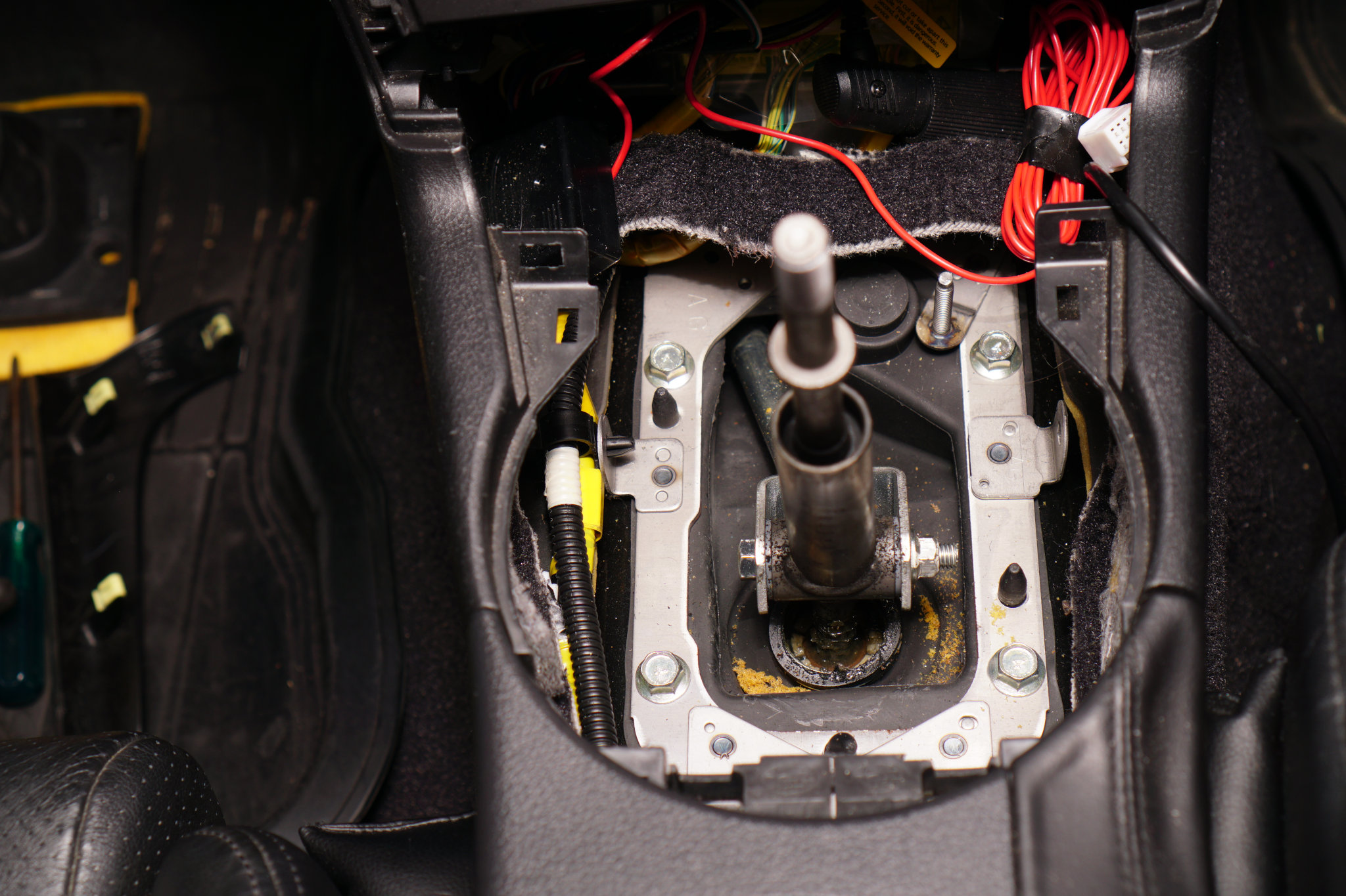 Factory shifter with rubber and foam sound deadening removed, and then the full removal of the old shifter - looks messy but was easily contained: